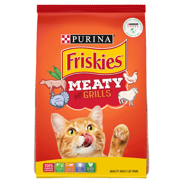 Friskies, by Purina, formulate a selection of complete and balanced dry and wet food for your feline friend. Is your kitty a meat lover? Look no further than Friskies Meaty Grills! This dry cat food serves up grillicious morsels of flavour including beef, chicken, lamb, turkey and a touch of garden veggies. Every enticing bowl offers a barbeque smorgasbord of scrumptious meaty flavours. Friskies Dry Cat Food is Complete and Balanced for adult cats.